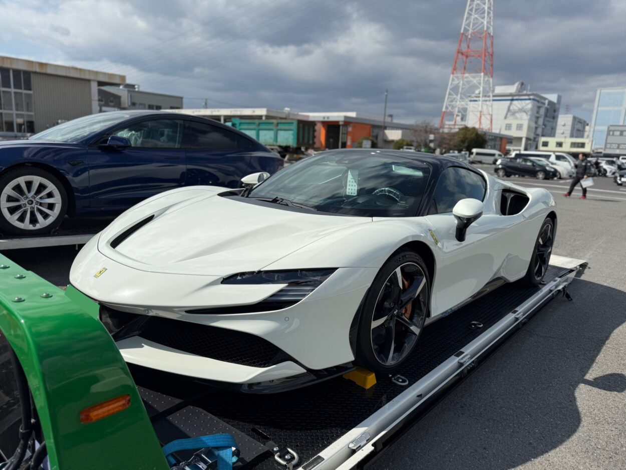 先日、フェラーリ SF90 のオーナー様よりご依頼をいただき、車検のために専用積載車で引き取りを行いました。