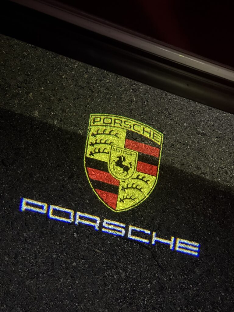 夜の乗車時、足元に浮かび上がる PORSCHE のロゴ。